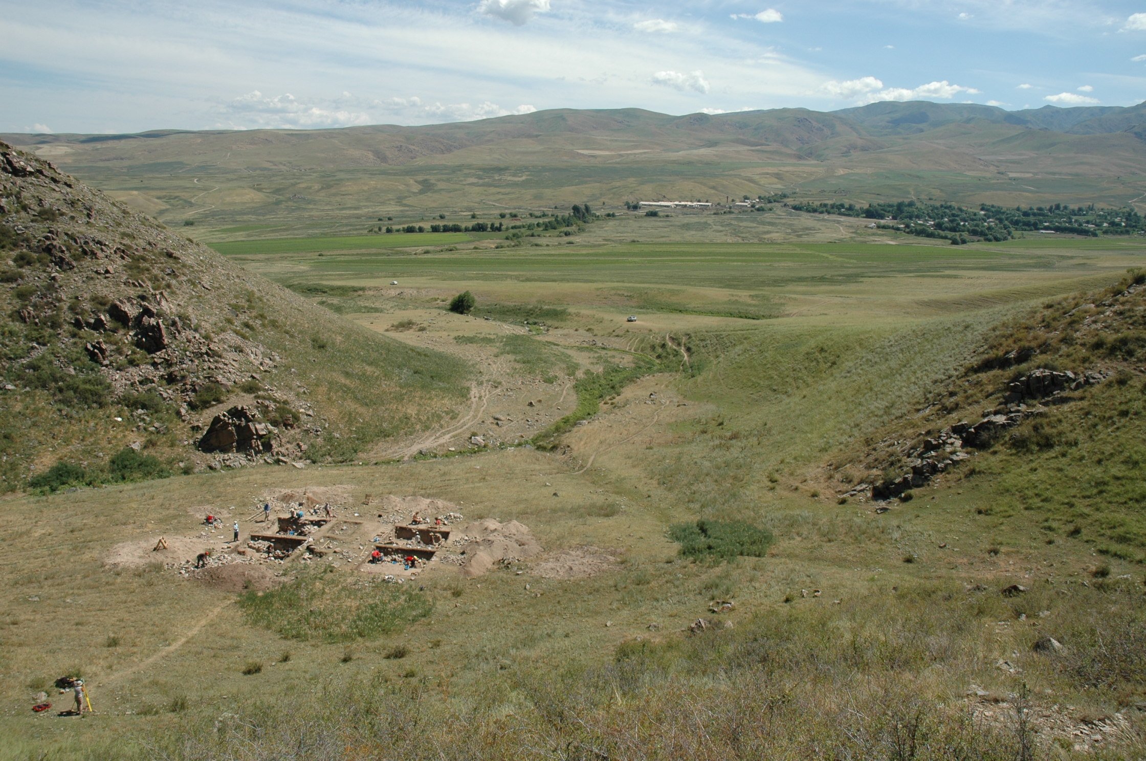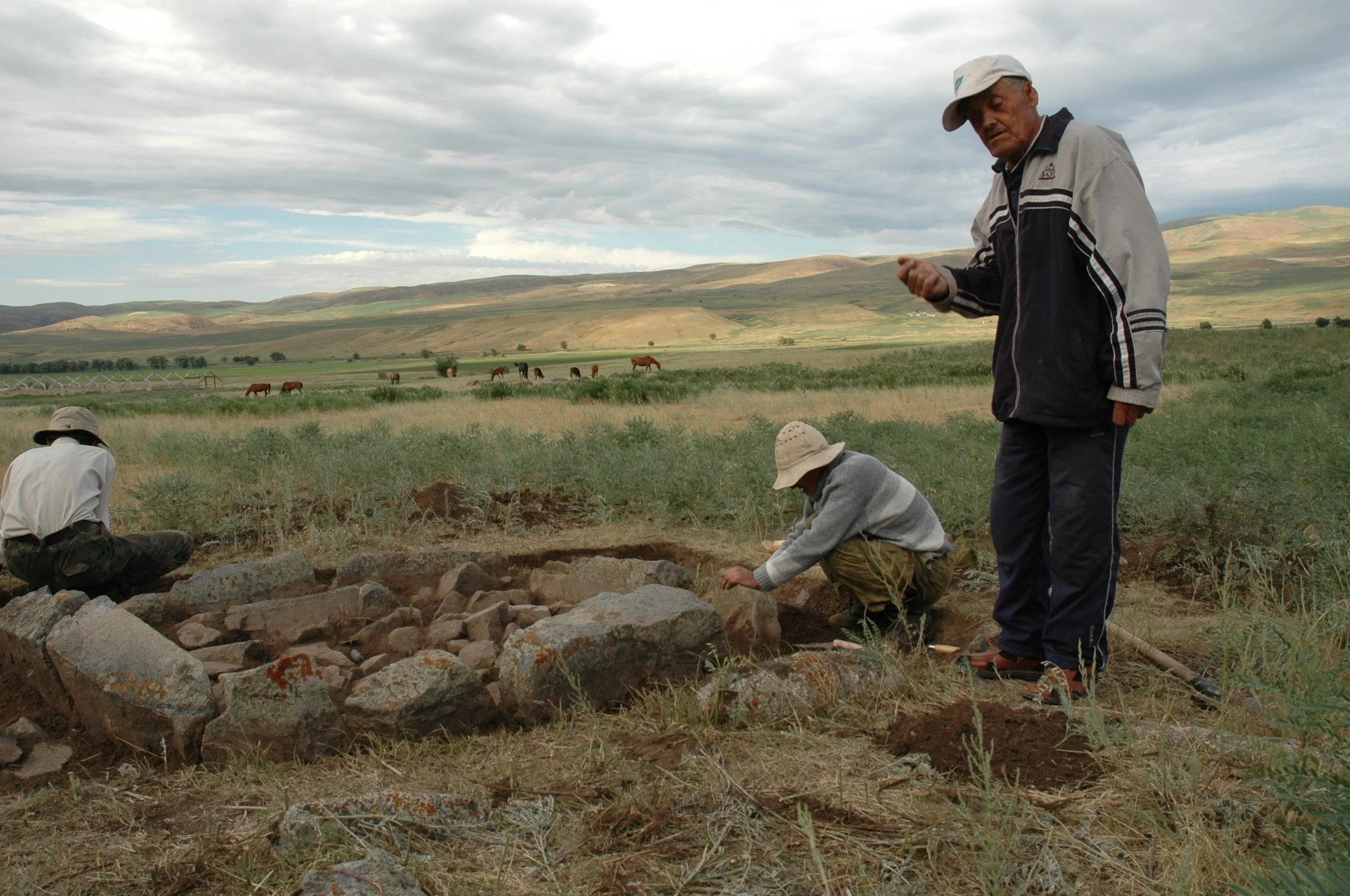 Excavations of Burial-1 began on the 19th of July, 2002. After opening a trench 3.25 x 4.10m, oriented in cardinal directions, a stone configuration of semi-rectangular form made of large stones was discovered. Within the stone fence, two stone cists oriented east to west lengthwise were revealed. The cists are constructed from flat stone plates, set on edge and aligned from end to end. The two cists are situated parallel to one another, with a shared wall separating the two chambers.
