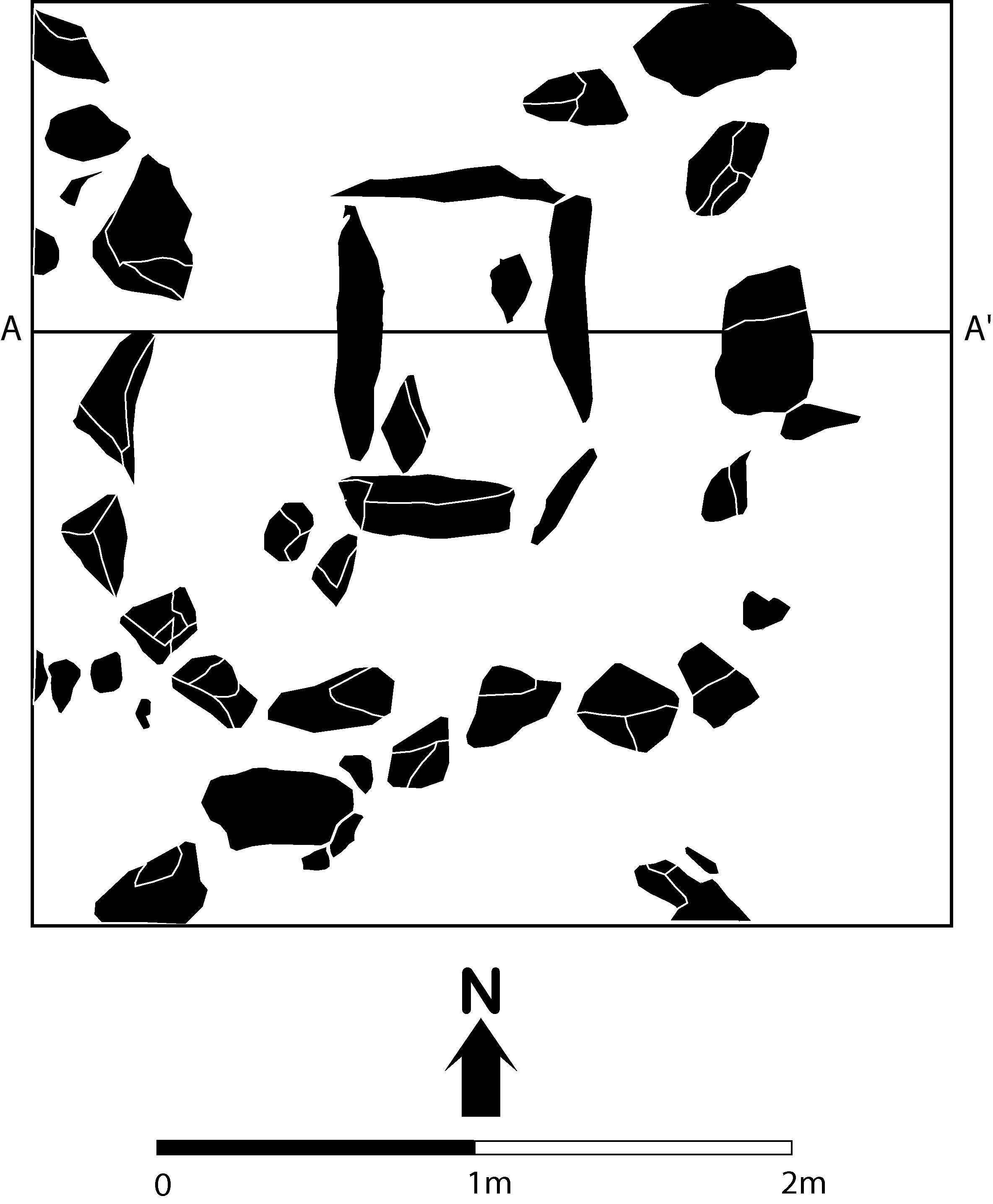 The rectangular configuration measured 2.10 m from north to south, and 2.30 meters east to west. A single stone lined cist was located at the center of the stone configuration, measuring 1m from north to south, and .70m east to west. The depth of the cist was .45 m. The cist was covered by a thick flat capstone, though the stone rested slightly askew over the vertical cist walls. The cist was covered on the western wall by a second flat stone plate. Inside the cist, neither skeletal nor cultural materials were found, suggesting that the burial was either never consecrated, or was thoroughly robbed of all materials. In most cases, robbed cists still contain fragments of bone, which suggests that the former interpretation is more likely.