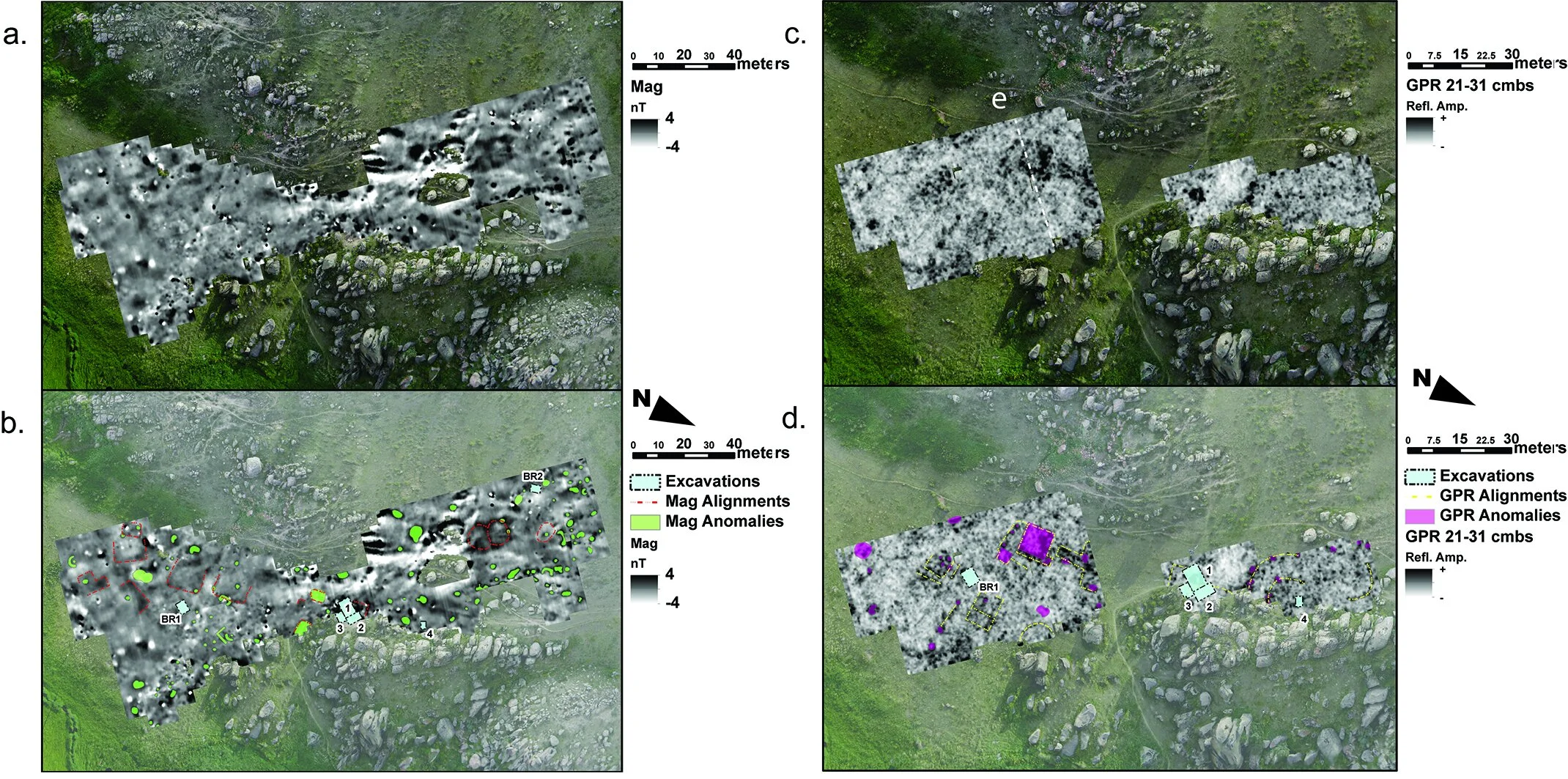 The geophysical imagery from Dali helped identify numerous isolated subsurface anomalies, as well as clear semi-circular and rectilinear alignments across the site area. The array of anomalies revealed through our geophysical surveys likely reflects a chronological palimpsest comprised of multiple dwellings, corrals, and burials that were built across the area of the site throughout its long-term occupation. Although each sensor revealed different kinds of anomalies, combining the results yields a visible pattern of settlements distributed across the site area along a North-South alignment (Fig. 5). When compared with associated features exposed in excavation, our visual and metrical analyses of the geophysical data suggests at least 10 house structures were distributed across the Dali site slope. The GPR results, in particular, show an alignment of 3-4 rectangular anomalies whose shapes conform with documented Bronze Age settlement foundation layouts in the region, such as those at Begash (Frachetti and Mar’yashev 2007).